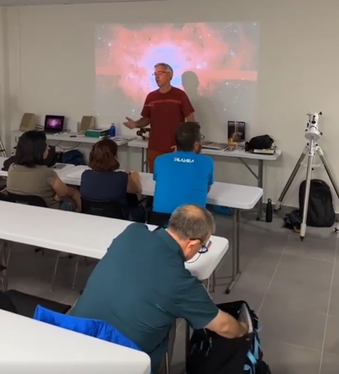 Las sesiones constan de una primera parte con una presentación y proyección (si es posible), una observación con puntero laser, observación a través de telescopios y finalmente unas fotos de recuerdo.